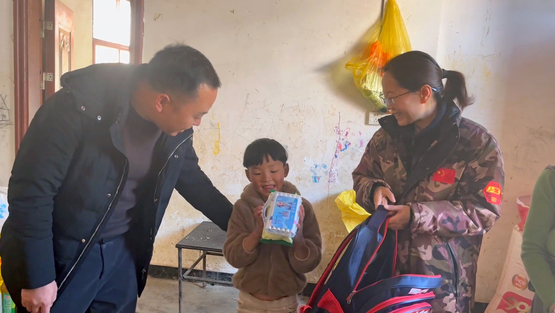当天,干部职工们分成多个小组,走进留守儿童的家中。“小朋友,你好呀!“叔叔阿姨好”“孩子,马上要过年了,这是给你的礼物。我们知道你学习特别努力,希望这个书包能陪伴你学到更多知识。”听到这些温暖的鼓励,孩子们重重地点头,脸上绽放出灿烂笑容,眼中闪烁着对未来的憧憬。